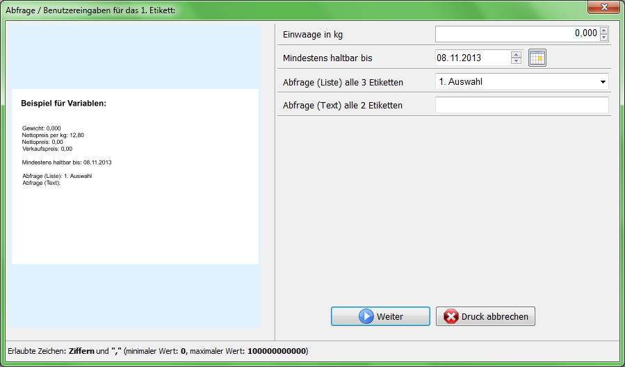 Zu Beginn des Druckes, bzw. je nach Angaben bei den Abfragevariablen, vor dem Druck jeden Etikettes erscheint das nebenstehende Dialogfenster, in dem die entsprechenden Werte eingegeben bzw. ausgewählt werden. Die Reihenfolge, in denen die Abfragen erscheinen kann dabei festgelegt werden.