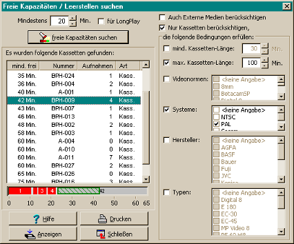 Mit freie Kapazitäten suchen werden alle Kassetten angezeigt, die noch eine freie Kapazität der gewünschten Mindestlänge aufweisen. Dabei wird die Lage der vorhandenen Aufnahmen berücksichtigt, d.h. die gesuchte Kapazität muss als eine durchgehende Lücke vorhanden sein.