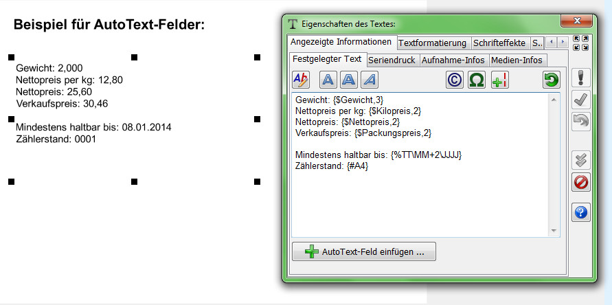 Normaler Weise werden bei Texten, Strichcodefeldern und 2D-Codefeldern die Texte bzw. Werte so angezeigt, wie diese angegeben wurden. Ausnahme davon ist, wenn Seriendruck-Felder angezeigt werden sollen.