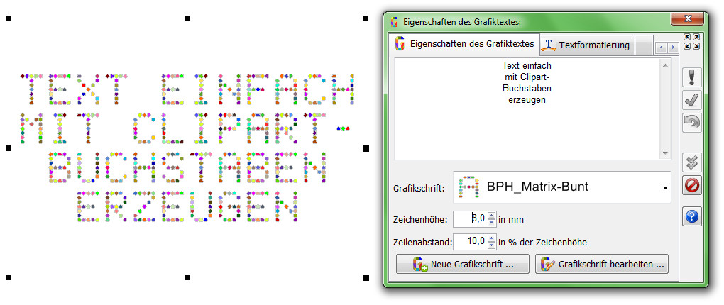 Mit dem Grafiktextobjekt ist dies nun genauso einfach wie man es von anderen Schriften gewöhnt ist. Es muss nur einmal angegeben werden, welche Grafikdatei für welchen Buchstaben bzw. Ziffer verwendet werden soll. Eine einmal so festgelegte "Grafik-Schrift" kann dann immer wieder verwendet werden. Auch in unseren anderen Druckprogrammen, in deren aktuellen Versionen ebenfalls das Grafiktextfeld verfügbar ist.