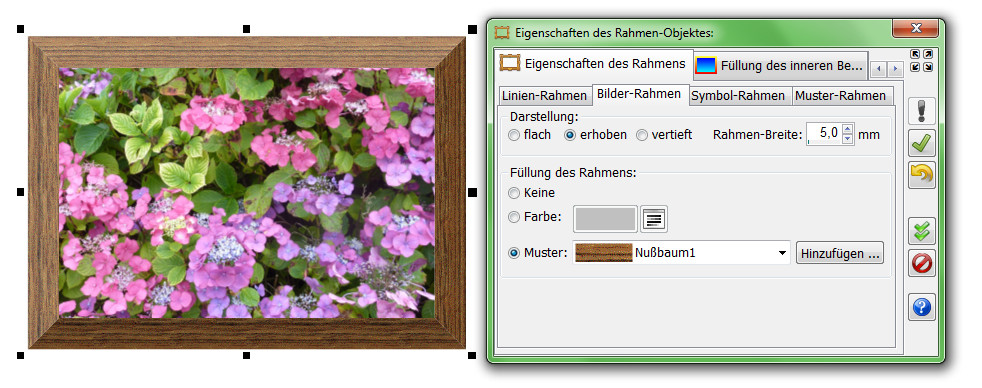 Bei dem Bilder-Rahmen erreicht man mit den Muster-Füllungen in der Regel die interessantesten Effekte. Die Füllung des inneren Bereiches kann auch ein Bild sein. Auf Wunsch passt sich die Größe des Rahmens an die Größe des Bildes an.