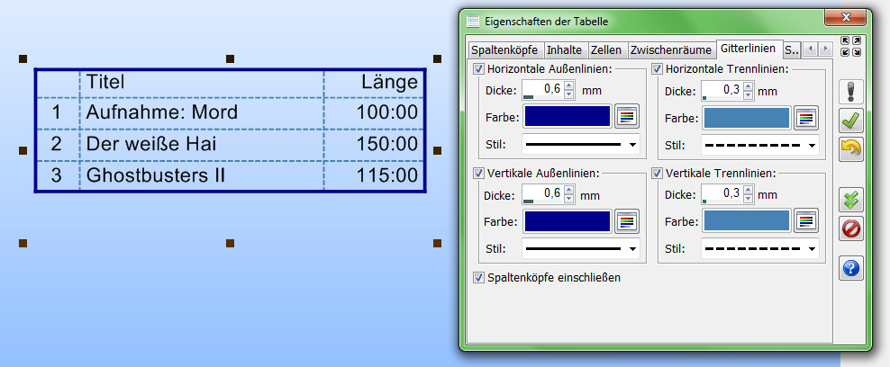 Die Tabelle kann optional auch Gitterlinien erhalten. Die Trennlinien werden auch ausgegeben, sofern keine Abstände zwischen den Spalten bzw. Zeilen gibt.