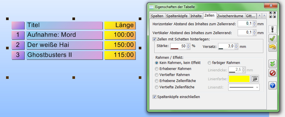 Ebenfalls ist es möglich, jede Zelle mit einem Schatten darzustellen.