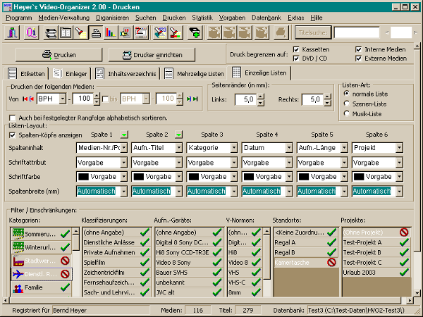 Bei der "Einzeiligen Liste" wird für jeden Titel bzw. Aufnahme nur ein Zeile ausgegeben. Die Inhalte der bis zu sechs Spalten kann ausgewählt werden. Nach den ersten beiden Spalten wird die Liste sortiert.