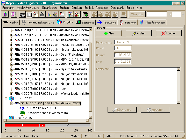 In dieser Funktion werden die Projekte verwaltet. In der Baumstruktur auf der linken Seite werden die Projekte und die entsprechend zugeordneten Medien angezeigt. Auf der rechten Seite sind nähere Informationen zum Projekt angezeigt.